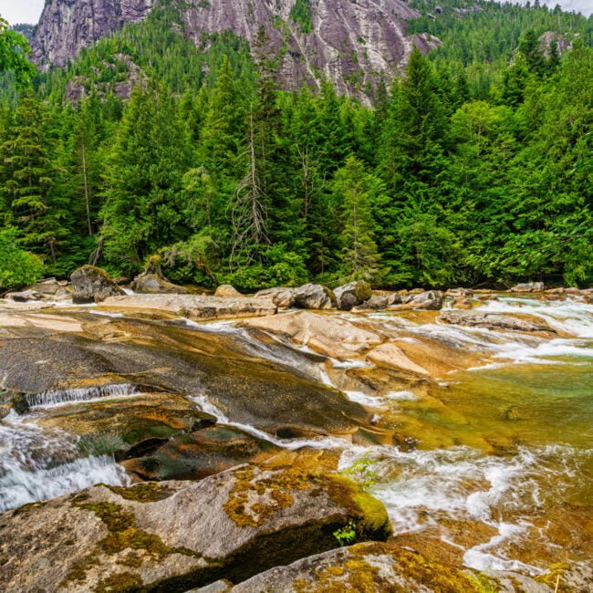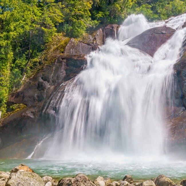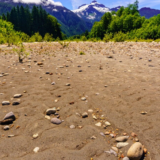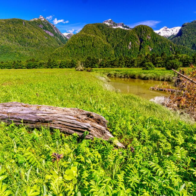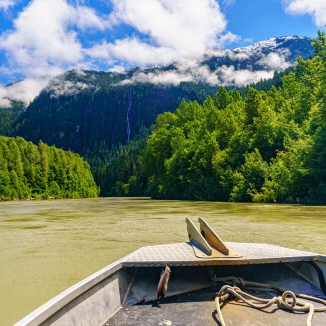 An der Mündung des Kingcome River treffen wir unseren First Nations Guide, der uns an Bord eines der Kingcome Raven Adventures Jetboote willkommen heißt. Die nächsten vier Stunden verbringen wir mit ihm auf dem Fluss, während wir an schneebedeckten Berggipfeln vorbeifahren sowie durch grüne Täler und so einige der schönsten Landschaften erleben, die British Columbia zu bieten hat.